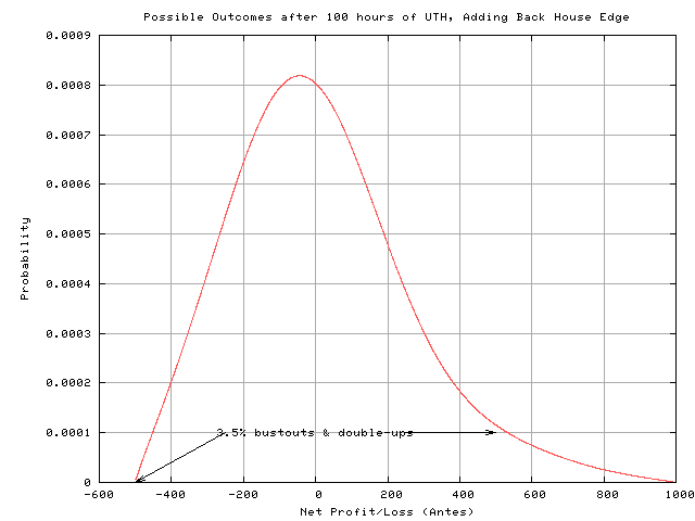 Let’s say you sit down with a bankroll of 100 Antes (i.e. $500 for a $5 Ante game). You decide before hand that you’ll play a maximum of 100 hands (about 3 hours), and that you’ll leave if you double up (+$500 profit), or bust out. In this scenario, you have an equal chance (1.5%) of busting out or doubling up. Otherwise, 97% of the time you’ll end up somewhere in-between, following the distribution below: