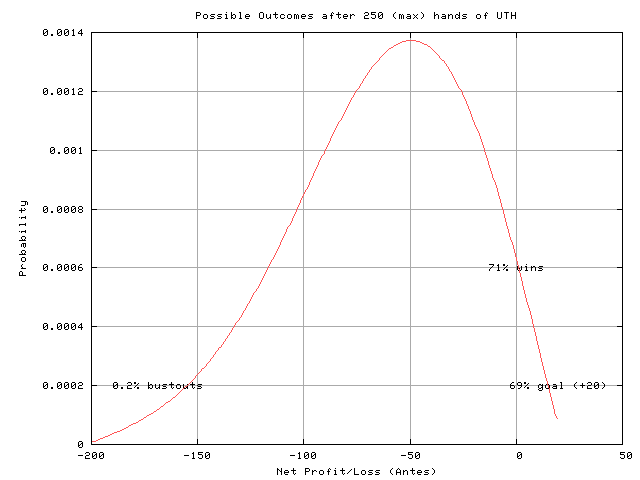 Say you have a big bankroll, are happy to hit-and-run after winning 20 Antes (i.e., $100 in a $5 Ante game), and are willing to grind out 250 hands. In this case, you have a 69% chance of making your $100, an overall 70% chance of winning, and only a 0.2% chance of busting out. The remaining 30% of the time, you’ll fall somewhere in-between, according to the following distribution: