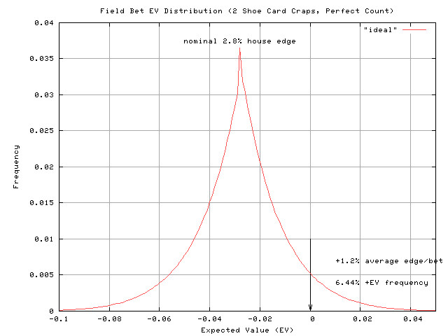 The above graph shows that with exact knowledge of the cards dealt from the shoes, the Field Bet becomes advantageous (+EV) 6.44% of the time. The average advantage of a +EV Field bet using a perfect count (e.g., a spreadsheet) is 1.2%. If the house deals deeper than 50% of the shoe, these results will improve.
