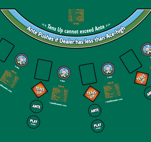 For the following Tens Up Bonus Paytable, the house edge is only -2.25% of an Ante. That’s an especially good deal, since most games with an optional bonus bet usually cost at least 2-3% of the Ante on the main game, AND another 2-3% of the bonus bet. Here, you get to play the Tens Up Bonus Bet and the main game against the dealer hand for a combined cost of -2.25% of an Ante. Furthermore, unlike other ShuffleMaster games like Ultimate Texas Hold’Em and Crazy 4 Poker, you don’t have to make a Blind Bet (or Super Bonus Bet) that only pays a high qualifying hand. So, I’d say the cost is half that of Ultimate Texas Hold’Em, and Crazy 4 Poker (when played with the optional bonus bet).
