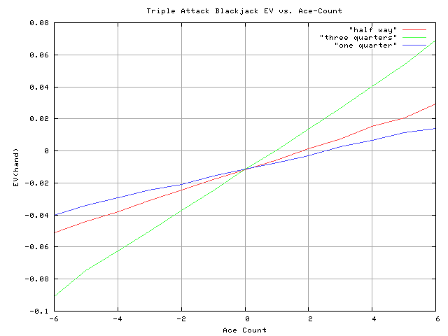 On the other hand, the shoe is +EV about 20% of the time (+2 or better count) after the first 1/4 of the shoe is dealt. So, if you just like varying your bet on a good count, you’ll really enjoy this game. Overall, if you Wong and only bet +EV Ace counts, then you’ll extract about +17% total EV out of a shoe (i.e., +0.17 bets/shoe). The Ace-count system is very easy to implement (e.g., use the height of muck cards to estimate the expected Ace count), and is very fun. Some people have a good idea of when the shoe is Ace-rich or not. That’s all you need to know for this Triple Attack game!