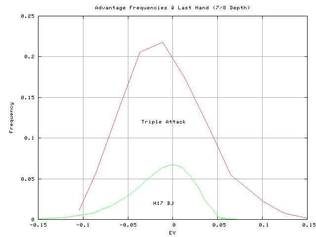 To graphically demonstrate the large +EV advantage obtained by a simple Ace count in Triple Attack Blackjack, I compared the EV frequencies at the 1/2 shoe depth to normal blackjack using the hi-lo count. The graph below shows the Triple Attack edge dominates that of normal blackjack. The edges obtained in Triple Attack are both larger, and more frequent than in standard blackjack. The Ace count in Triple Attack is much simpler to track, compared to the hi-lo count, because you only have to identify one card — the Aces. The graph clearly shows that if you’re going to count at a shoe game, you should play Triple Attack. (Compare the areas under the curves, to the right of EV=0.)