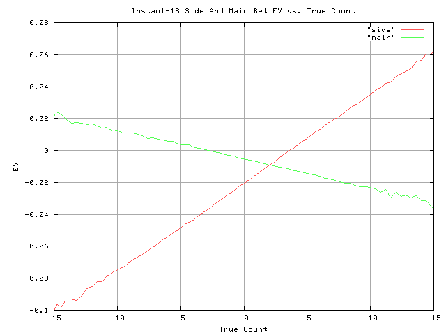 So, by itself, the Instant-18 side bet gets good (true count >= 4) about 7.8% of the time, with an average return of +1.53%.