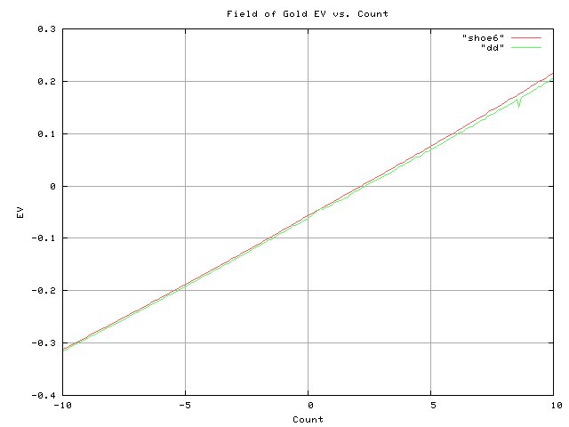 Everybody thank Eliot Jacobson for working for you. He emailed me this morning telling me the Field of Gold blackjack side bet was crushable. And it is. For real. The count is simple, and for a 6-deck shoe game, you’ll be able to bet 19% of the time, with an average edge of +6.5%/bet. That’s a profit of ($25 bet)(19% bet/hand)(+6.5% EV/bet) = $0.31/hand. For double-deck, the numbers are even better, yielding 27% betting opportunities with an average edge of +8.2%/bet. For $25 bets, that yields a profit of $0.55 per hand dealt. That adds up pretty quickly. It’s more than $100/hr.