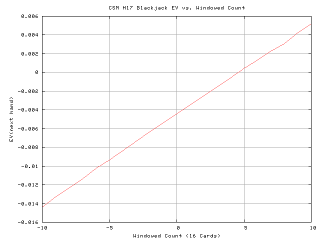 The graph shows a very linear relationship between the 16-card windowed hi-lo count and the EV of the next hand. When the running windowed count is +5 or more, the next hand from the CSM is +EV. The windowed count is ≥ 5 about 8.2% of the time.