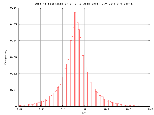 Of course it has to be bad, since the first thing everyone thinks about is counting for 10’s and 9’s, and waiting until the end of the shoe to whoop out the $500 and $1000 Bust Me bets on hard-13. (The rack cards make it clear you can bet the table limits at any time, regardless of the size of your main bet.) I thought there might be frequent +EV opportunities, so I plotted the distribution of EV’s for the hard-13 bet throughout the shoe:
