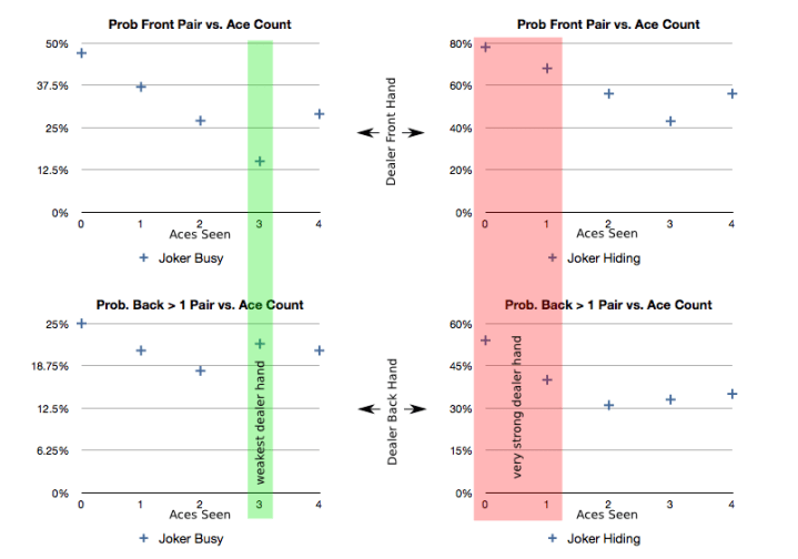 Now, say you had the J’s and 5’s again, but this time you have an Ace kicker. This is a decision point that people may think about. Most house-way strategies will play two pair behind. You should definitely play two pair behind when the Joker is hiding. However, when the dealer hand is extremely weak because the Joker is busy and exactly 3 Aces are seen (“3 Ace Effect”), ignore your Ace, and play pair-pair. This is normally considered aggressive, but against the weakest dealer hand (the most common case, 34.3% of the time), you should go for it. The “3 Ace Effect” creates the “sweet spot” that minimizes the expected dealer front hand strength.
